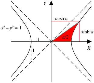 siendo t el doble del área de la región comprendida entre el semieje positivo X, y el segmento OP y la hipérbola, según las siguientes igualdades: