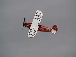 En una Eagle similar Juan Ignacio Pombo voló en 1935 hasta México, hazaña que hizo un hueco a esta avioneta en la historia aeronáutica española. La G-AFAX es totalmente propiedad de la FIO y se encuentra en perfecto estado de vuelo. Es una de las pocas con de su tipo con tren de aterrizaje fijo que quedan en vuelo. | ||||||||||