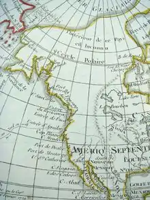 ![]() Este mapa de 1753 del cartógrafo francés Philippe Buache localiza a Fusang ("Fou-sang des Chinois", "Fusang de los chinos") al norte del estado de California, en el ámbito de la Columbia Británica.