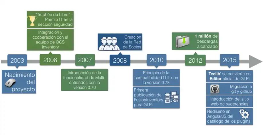 En 2009, Teclib’ empezó la integración del software y se convirtió en un actor clave en el desarrollo de la solución, vía el desarrollo del código de GLPi y la implementación de nuevas funcionalidades. Durante el verano 2015, los líderes de la comunidad de GLPi decidieron traspasar la gestión de la Roadmap y del liderazgo del desarrollo a Teclib’.[6]