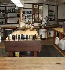 - Era industrial posterior a la Primera Guerra Mundial. El creciente interés en la eficiencia del hogar llevó a los pioneros estudios de movimiento de las labores domésticas en la década de 1920 por parte de la psicóloga industrial Lillian Moller Gilbreth . Las mejoras posteriores en el diseño de la cocina sentaron las bases para los gabinetes empotrados familiares de la actualidad. En ese momento, las superficies de trabajo solían estar hechas de linóleo o acero inoxidable . Las mejoras en la tecnología eventualmente hicieron posible la producción de gabinetes a escala industrial.