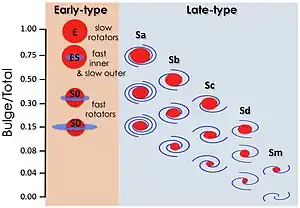 Este esquema, obtenido a partir de estudios realizados de galaxias lenticulares situadas en el Cúmulo de Virgo, refuerza la idea de que las galaxias lenticulares y esferoidales, al menos en cúmulos de galaxias ricos, proceden de galaxias espirales e irregulares que han perdido su materia interestelar cómo se detalla a continuación.