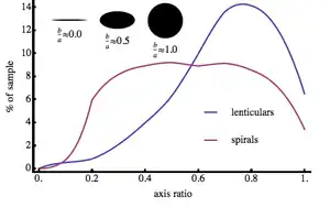 Las galaxias lenticulares son únicas porque tienen un componente de disco visible y un componente de protuberancia prominente. Tienen una relación protuberancia-disco mucho mayor que las espirales típicas y no tienen la estructura canónica de brazos espirales de las galaxias de tipo tardío, aunque pueden mostrar una barra central.[1] Esta dominancia de la protuberancia puede verse en la distribución de la relación de ejes (es decir, la relación entre los ejes menor y mayor observados en una galaxia de disco) de una muestra de galaxias lenticulares. La distribución de las galaxias lenticulares aumenta de forma constante en el intervalo de 0,25 a 0,85, mientras que la distribución de las espirales es esencialmente plana en ese mismo intervalo.[2] Las relaciones axiales mayores pueden explicarse observando galaxias de disco de frente o teniendo una muestra de galaxias esferoidales (dominadas por el bulbo). Imagina que observas dos galaxias de disco de canto, una con protuberancia y otra sin protuberancia. La galaxia con una protuberancia prominente tendrá una relación axial de borde mayor que la galaxia sin protuberancia, según la definición de relación axial. Por tanto, una muestra de galaxias de disco con componentes esferoidales prominentes tendrá más galaxias con relaciones axiales mayores. El hecho de que la distribución de galaxias lenticulares aumente al aumentar la relación axial observada implica que las lenticulares están dominadas por un componente central con protuberancia.[1]