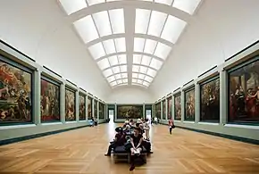 - En Francia hay también muchas galerías célebres tales como la galería del Louvre. Su bóveda, aunque por mucho tiempo blanca, fue adornada de casetones y rosetones por orden de Napoleón I. Las paredes están cubiertas de cuadros de los más célebres pintores de todas las épocas. También es destacable la Galería de los Espejos del Palacio de Versalles.