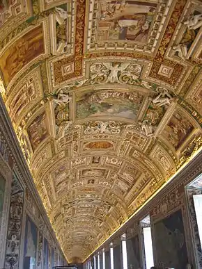 - Galería de los Mapas que tiene sus bóvedas adornadas con 52 figuras representando individuos del Antiguo y del Nuevo Testamento y los entrepaños y los vierteaguas de las ventanas están cubiertos de arabescos donde Rafael demostró la gracia y diversidad de su genio.