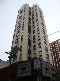 Desde el basamento, se erige la torre, sostenida sobre cuatro pentágonos que se apoyan en las columnas de la galería, proyectándose hacia los extremos de cada ala de la planta cruciforme del edificio. Aquel tiene veintidós pisos con ocho departamentos en cada uno, pensados de manera flexible para poder ser utilizados como oficinas al eliminar el espacio de la cocina para integrarlo con la sala de estar.