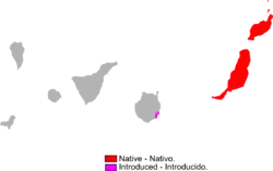 Está presente en Lanzarote y Fuerteventura así como en otros pequeños islotes como La Graciosa, Montaña Clara, Alegranza, Roque del Este e Isla de Lobos. Existe otra población pequeña y muy localizada en la costa oriental de Gran Canaria (Arinaga) pero se considera introducida.