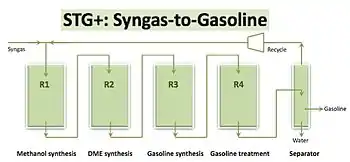 El proceso STG+ sigue 4 pasos principales en un ciclo de proceso continuo. Este proceso consta de 4 reactores de lecho fijo en serie en los que un gas de síntesis se convierte en combustibles sintéticos. Los pasos para producir gasolina sintética de alto octanaje son los siguientes:[9]