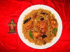 - Biryani, (en árabe: برياني) – un plato muy común, que consiste en arroz muy condimentado cocinado con pollo o cordero. Originario del subcontinente indio.[3]