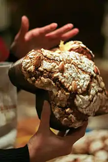 Otros dulces famosos de la región son el turrón de Cremona (turòon),[26] según la leyenda creada por los pasteleros locales para la boda de Francesco Sforza y Bianca Maria Visconti, y amaretti di Saronno, galletas crujientes hechas de almendras , albúmina y armelina. Probablemente influenciados por la repostería piamontesa son el baci di Cremona, similar al baci di dama pero con una galleta crujiente hecha de harina de avellana, y el baci del Signore di Pavia, más aplanado, relleno de mermelada de naranja y medio cubierto de chocolate derretido.[27] Entre otras galletas, tenemos las offelle di Parona, a veces preparadas con harina de arroz, mostaccini, una galleta cremonese preparada con la adición, entre otras especias, de clavo , maza, cilantro y anís estrellado, biscottini di Prosto, una galleta con un alto contenido de mantequilla cocida dos veces al horno típica de Valchiavena.