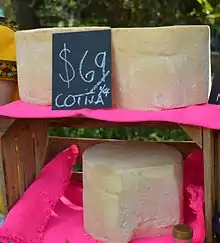 • Queso de Cotija: queso duro y seco, parecido al feta, el único queso que tiene denominación de origen en México. Se elabora con leche bronca de vaca (raza cebú[18]), sal y cuajo.[19] Proviene de las zonas montañosas de Michoacán, concretamente de Cotija de la Paz, en la sierra de Xalmich, donde se instalaron españoles y criollos y enseñaron la técnica del queso a los nativos, y se realiza en la época de lluvias (julio-octubre).[20] Otro queso renombrado michoacano es el Queso de La Ruana.
