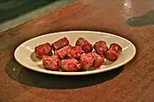 Entre las carnes se tiene el cerdo, que participa en embutidos como el chorizo de Pamplona, en las chuletas a la navarra o las magras a la navarra y a la pamplonesa.[12] Uno de los embutidos más típicos de Navarra es la chistorra, que se trata de un chorizo con un calibre menor del habitual. El asado de Gorrín (cochinillo asado) es popular en algunas poblaciones navarras. El cordero de Navarra posee la Indicación Geográfica que protege a los corderos procedentes de las razas Navarra y Lacha en pureza. De esta carne de cordero se elaboran platos como el cochifrito navarro y los chilindrones (influencia de la cocina aragonesa), elaborados con ternera o cerdo. Existen igualmente los famosos estofados de toro procedentes de los encierros de julio en la ciudad de Pamplona. La carne de ternera se encuentra bajo indicación geográfica protegida (Ternera de Navarra/Nafarroako Aratxea). Con la carne de ternera se pueden elaborar redondos, asados, etc. Un plato de carne en Navarra es, por definición, de ternera.[13]
