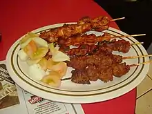 - Suya, del norte de Nigeria, es carne a la parrilla cubierta con ají molido, polvo de maní y otras especias locales. Se prepara al estilo barbacoa en un palo. Este es uno de los manjares nigerianos más famosos y se puede encontrar fácilmente en todo el país.[2]