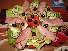 Las ensaladas se presentan con elementos vegetales y cárnicos en forma de vegetales. Las ensaladas de pescado como la Salata de icre