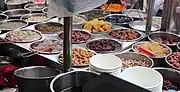 - Maíz — muchos vendedores se especializan en un tipo de maíz, pero otros pueden ofrecer varios, tanto salados como dulces. A veces se cuece al vapor, se asa a la parrilla, se hierve, etcétera.