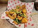 - Trozos de pollo frito — trocitos de pollo frito cubiertos con pimienta, guindilla y albahaca frita.