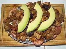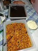 ![]() Pabellón criollo, plato emblemático de la gastronomía venezolana, el cual lleva carne mechada, tajada, arroz y caraota | ||