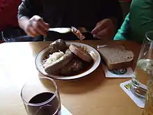 - Läwwerknepp (Knödel elaborado con hígado) o Flääschknepp (Knödel elaborado con carne), se puede bien servir con Sauerkraut.