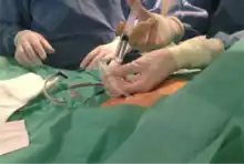 El procedimiento se realiza con el paciente en decúbito supino. Se monitoriza y se realiza limpieza y desinfección del área quirúrgica. Al tratarse de un procedimiento limpio no contaminado no hay necesidad de realizar profilaxis antibiótica según la evidencia actual.[3] Sin embargo, en pacientes con neoplasia de ninguno y cuello o immunodeprimidos es recomendable una dosis de cefazolina 1 g IV.