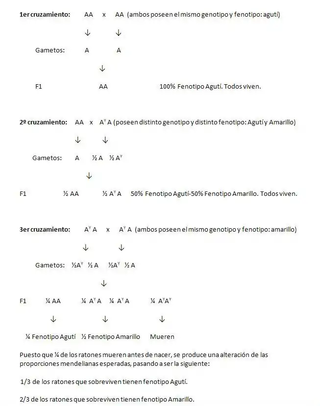 Cuando se realiza un cruce entre los ratones heterocigotos, según las leyes de Mendel, se esperaría una proporción 1/4 homocigoto para el color amarillo, 1/2 heterocigoto para el color amarillo y 1/4 homocigoto para el agutí. Pero los resultados obtenidos indican que dos tercios son amarillos y un tercio son agutí, ya que el primer 1/4 muere antes de nacer.