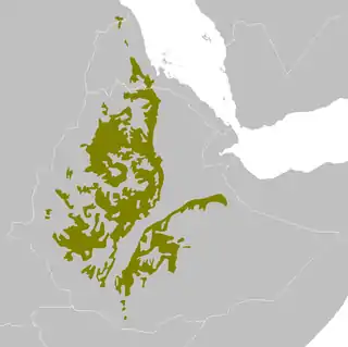 Ambas regiones, la selva montana y las praderas y bosques de montaña, ocupan cada una más de doscientos mil kilómetros cuadrados en Etiopía.[21] Por encima de los 3000 m se encuentra el páramo montano de Etiopía, unos 25 000 km² repartidos por el país, con dos especies importantes en claro peligro de extinción, la cabra montés de Etiopía (Capra walie), en gravísimo peligro de extinción, y el nyala de montaña (Tragelaphus buxtoni).