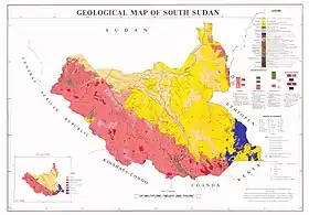 En cuanto a la geología, Sudán del Sur está atravesado por una rama del Rift de África Oriental que incluye las cuencas de Muglad y Melut, que poseen grandes reservas petrolíferas en la frontera con Sudán y han provocado graves conflictos. Los campos petrolíferos se encuentran en el centro y este del país, una inmensa zona aluvial formada por sedimentos recientes y del Terciario y el cuaternario, con arcillas y gravas no consolidadas. En la cuenca de Melut, en la frontera con Etiopía, se encuentran los campos petrolífero de Palogue, explotado por la Corporación Nacional de Petróleo de China, y Adar, explotado por Chevron. En la cuenca de Muglad, zona donde se unen los ríos Jebel y Ghazal, destacan los pozos petrolíferos de Unity (Chevron), Fula (Chevron) y Block 5A (Petronas). En cualquier caso, los conflictos hacen que la producción sea irregular de año en años, así como los consorcios que explotan los yacimientos.[5]