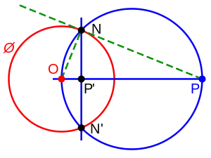 Para construir el inverso P' de un punto P situado fuera de un círculo Ø: