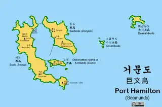 En 1884, fue el secretario de Marina de los Estados Unidos quien planeó el establecimiento de una base naval en Port Hamilton, pero finalmente fueron tres buques de guerra británicos los que ocuparon la isla a partir de abril de 1885 tras el incidente de Panjdeh en Afganistán, que dio lugar a una disputa diplomática. Conflicto entre Rusia y el Reino Unido.[1] El objetivo de esta acción era frustrar las actividades de la marina rusa en esta región. Los ingleses construyeron algunos edificios e instalaciones defensivas y obtuvieron permiso de China para tender un cable telegráfico hasta Wusong en la desembocadura del río Azul para permitir comunicaciones rápidas con Shanghái y el resto del mundo.[2]