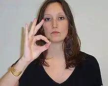 El signo del pulgar y el índice unidos adquiere varias letras en diferentes sistemas de deletreo manual . El alfabeto manual americano reserva para la letra F, mientras que en el lenguaje de señas irlandés y francés es la letra G.[48] En los deletreos digitales que representan sistemas alfabéticos cirílicos, como el alfabeto manual ucraniano, el gesto representa la vocal O y refleja la forma de esa letra.[49] De manera similar, el alfabeto manual coreano utiliza el gesto de la letra Hangul " ㅇ ", romanizada como "ng" para reflejar su pronunciación en coreano hablado.[50] En yubimoji (指 文字), el alfabeto manual de japonés cuyos 45 signos y cuatro diacríticos representan los fonemas del idioma japonés, el gesto es la sílaba " yo " (め en hiragana, メ en katakana ).[51] Varios sistemas de deletreo manual pueden requerir otras características específicas del gesto más allá de su dedo pulgar e índice unidos con los dedos restantes entretenidos. Por ejemplo, el anillo en el gesto "yo" de yubimoji es ligeramente cónico en lugar de redondeado.[52]