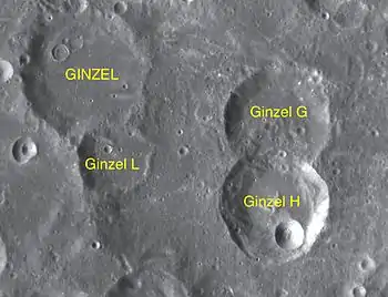 ![]() Vista blicua desde el Apolo 14 con una cámara Hasselblad de los cráteres Dreyer y Ginzel, con algunos de sus cráteres satélita. Desde el centro, Ginzel aparece hacia el norte, y Dreyer al oeste-suroeste. Ginzel G y "Ginzel H se hallan al este. Ginzel L aparece al sur de Ginzel. | ||