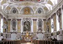 - Iglesia del monasterio de Neustift en Freising (hacia 1700), reconstruida por el cantero de la corte de Freising, Johann Jakob Mafiol, bajo la dirección deViscardi (1700-1722).
