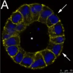 Las células epiteliales de los acinos mamarios muestran una polaridad apical-basal marcada. Gracias a esta polaridad son posibles las funciones celulares. La polaridad del citoplasma determina una célula acinar con un dominio de superficie apical secretor y otro dominio basolateral de transporte.[6][7]