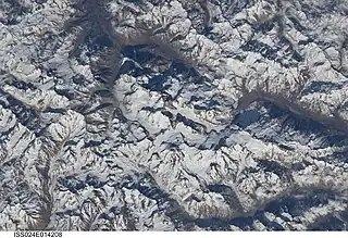 ![]() Imagen satelital de los glaciares Universidad (centro, izquierda) y Cipreses (centro derecha), este último dando origen al río homónimo | ||