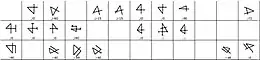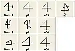 - Variante posicional de un signo lapidario es el que presenta inclinación positiva o negativa respecto a la vertical (0º) considerada como referencia en el signo patrón original. Incluye los sentidos de giro vertical, horizontal, dextrógiro y levógiro.