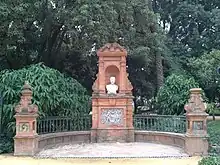 Es de ladrillo visto, con forma semicircular y bancos con respaldos de hierro hierro. Los bancos están rematados en sus extremos con pináculos que tienen debajo en, una de las caras, anaqueles para libros, y en otras azulejos con escenas costumbristas sevillanas.