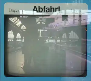 Horario de trenes mostrado en una pantalla de CRT con cristal de cubierta a prueba de vandalismo, que muestra reflejos distintos de las fuentes de luz ambiente (cielo, lámparas). La información visual sólo puede ser leída (con muy bajo contraste) en las regiones con sombra.
