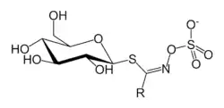 Los glucosinolatos (también denominados tioglicósidos) son S-glicósidos en los que la glicona es b-D-tioglucosa y la aglicona es una oxima sulfatada.[1] Son compuestos naturales del metabolismo secundario de las plantas, principalmente presentes en las Brassicas. Originalmente también se denominaron "mustard oil glucosides" (glucosidos de áceite de mostaza) o "tioglucósidos", ya que se descubrieron como derivados de los aceites de mostaza. Se hidrolizan por las enzimas mirosinasas (Rodman 1981[2]), para dar lugar a los isotiocianatos, que constituyen las moléculas activas. Estas moléculas contribuyen a la defensa de las plantas frente a insectos y patógenos y también tienen propiedades beneficiosas para la salud humana debido a su potencial mecanismo de protección frente a infecciones y al cáncer (Traka y Mithen, 2009).[3]