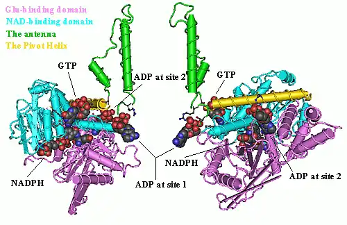 Cada dominio está coloreado diferente - Glu-BD, NAD (P)-BD, antena, la hélice pivote. Los reguladores alostéricos están mostrados como modelos de esferas. Esta estructura particular de la GLUD1 es una combinación de dos estructuras por rayos X - una con una GTP unida (1HWZ) y la segunda con un ADP unido (1NQT). Aunque no es real, esta estructura muestra la posición relativa de los efectores alostéricos cuando se unen a la GLUD1. El NADPH y el glutamato también se muestran.