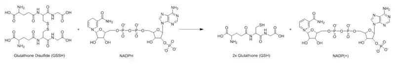 , el cual toma un protón desde el solvente y se libera de la enzima en forma de una segunda molécula de GSH. De esta forma por cada molécula de GSSG y NADPH, se liberan dos moléculas de GSH, las cuales pueden actuar como sumideros antioxidantes para las especies reactivas de oxígeno dentro de la célula.[9]