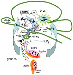 Las neuronas peptidérgicas que co-sintetizan kisspeptina (KP), neuroquinina B (NKB) y dinorfina (DN) en el núcleo arqueado hipotalámico ('neuronas KNDy') desempeñan un papel fundamental en la retroalimentación negativa de los esteroides sexuales a las neuronas hipofisiotrópicas de la hormona liberadora de gonadotropina (GnRH).[9][10]