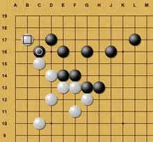 Se denomina ko a una formación especial en la que blancas y negras pueden capturase unas a otras indefinidamente.[87] Esto daría lugar a una repetición infinita de la posición en el tablero, sin ningún progreso en la partida. La regla del ko existe para prohibir este ciclo infinito.