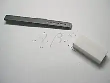 Originalmente hecho de caucho natural, pero ahora generalmente al ser más barato, contiene elementos de partículas minerales y un abrasivo como la piedra pómez con un plastificante como el aceite vegetal.[7] Son relativamente duros (para permanecer adheridos al lápiz) y con frecuencia se tiñen de rosa.