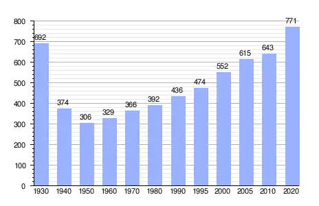 En 2020 registró una población de 771 personas, lo que corresponde al 4.21 % de la población municipal.[7] De los cuales 392 son hombres y 379 son mujeres.[7]