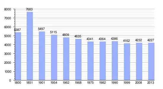 Los datos entre 1800 y 2013 son el resultado de sumar los parciales de las catorce comunas que forman la nueva comuna de Gouffern-en-Auge, cuyos datos se han cogido de 1800 a 1999, para las comunas de Aubry-en-Exmes,[4] Avernes-sous-Exmes,[5] Chambois,[6] Courménil,[7] Exmes,[8] Fel,[9] La Cochère,[10] Le Bourg-Saint-Léonard,[11] Omméel,[12] Saint-Pierre-la-Rivière,[13] Silly-en-Gouffern,[14] Survie,[15] Urou-et-Crennes[16] y Villebadin[17] de la página francesa EHESS/Cassini. Los demás datos se han cogido de la página del INSEE.[18]