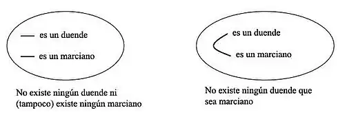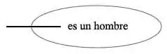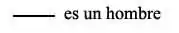 - Aquí tenemos la unión de dos gráficos: una línea de identidad vacía exterior que significa "algo existe" y una línea de identidad al interior de un recorte que expresa que no es el caso que exista al menos un individuo que cumpla el predicado "es un hombre". La unión de ambas líneas en el preciso punto en el que intersecan el recorte expresa la existencia de dos individuos opuestos: "existe algo" y "ese algo que existe no es un hombre". En lenguaje corriente: existen entidades que no son hombres.