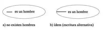 - Un ejemplo fácil es la negación de proposiciones existenciales. En el ejemplo siguiente, la afirmación de que "existen hombres" se niega (gráficamente se la "recorta") envolviéndola al interior de un óvalo. Se expresa así, que no es el caso que existen hombres, o en lenguaje corriente: no existe ningún hombre.