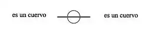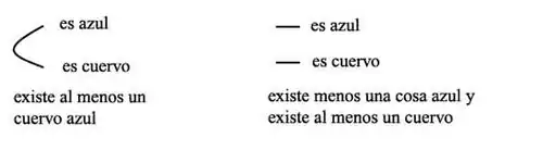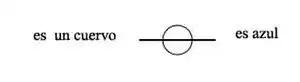 - Una línea de identidad intersecada por un recorte expresa la no identidad de los individuos referidos por los predicados conectados por la línea de identidad. Así, el ejemplo siguiente expresa que existe el menos un cuervo y que existe al menos algo de color azul que no es el cuervo (ambos objetos no son idénticos).