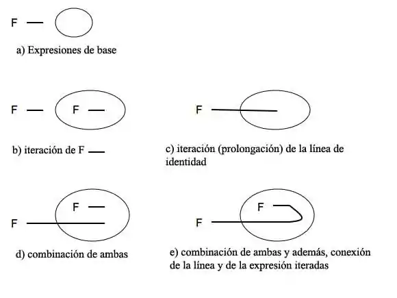 - La interacción de una proposición y la iteración de una línea de identidad pueden ser combinadas conjuntamente de tal forma que la extremidad libre de la línea iterada se conecte con la proposición iterada.
