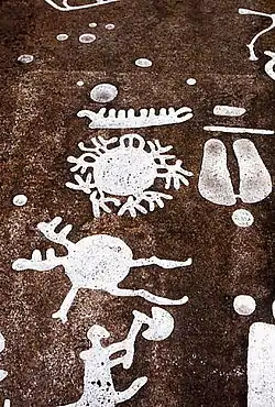 Un motivo particular está compuesto de un pequeño disco rodeado de cuatro figuraciones ramificadas. Puede tratarse del sol y sus rayos o de la tierra y sus plantas. Para algunos el motivo da prueba de un culto solar, para otros tal culto, que no tuvo lugar más que en un período de la Edad del Bronce, tiene poca importancia en la comprensión de los grabados rupestres.