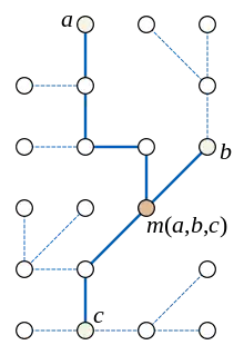 - un camino en sí mismo, en cuyo caso la mediana m(a,b,c) es igual a uno de los nodos a, b o c, dado que alguno de ellos se encontrará entre los otros dos en el camino, o bien